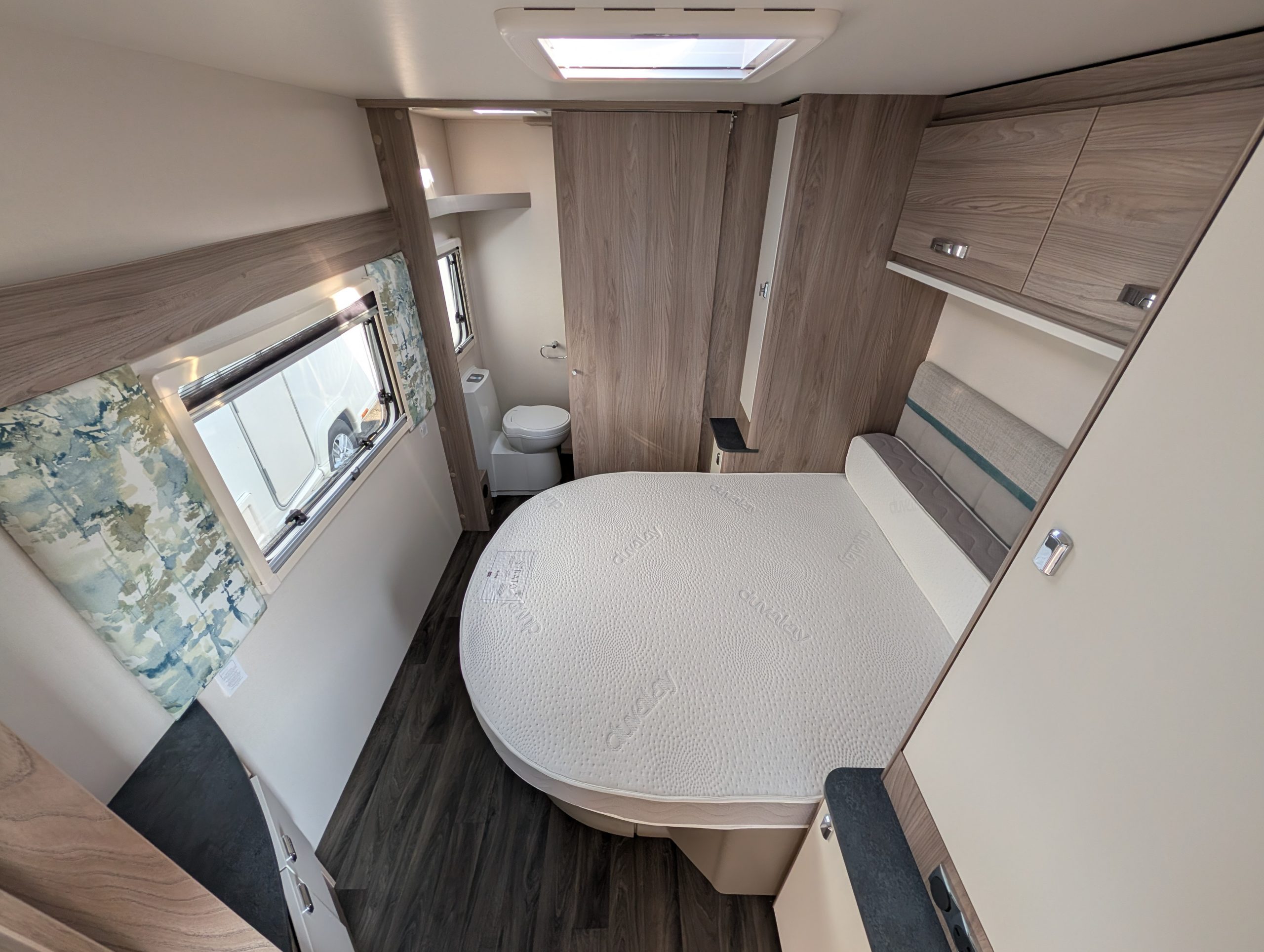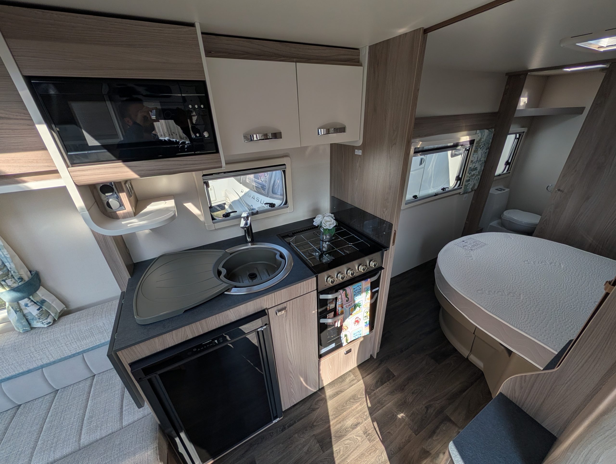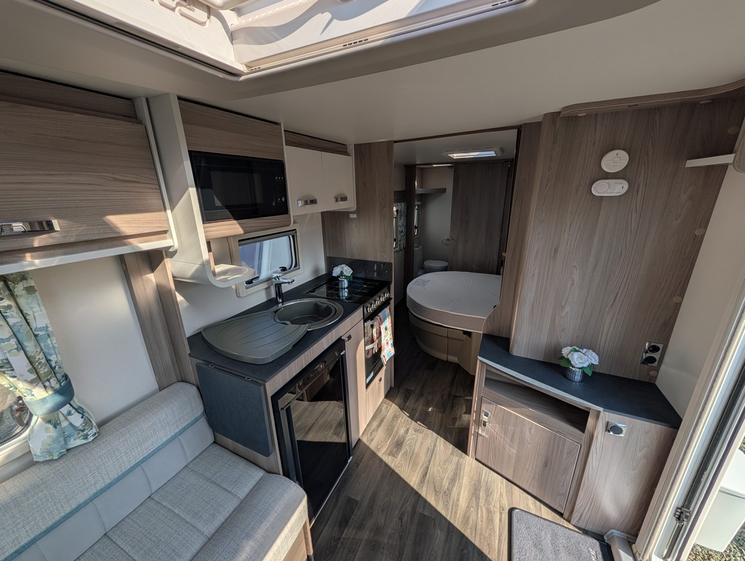 - Kitchen & Tech: Features an under-counter Dometic fridge/freezer, built-in microwave, and, on many models, a 100W solar panel for off-grid capabilities.